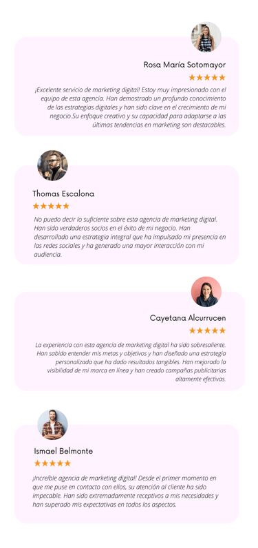Somos un equipo altamente talentoso y apasionado que está listo para impulsar tu éxito en línea. Nuestros expertos en marketing digital, diseñadores creativos, especialistas en redes sociales y desarrolladores web están comprometidos en brindarte soluciones efectivas y estratégicas. Trabajamos en estrecha colaboración contigo para comprender tus necesidades y objetivos, y juntos creamos estrategias personalizadas que generan resultados excepcionales. Con un enfoque centrado en el cliente y una búsqueda constante de la excelencia, nuestro equipo está constantemente actualizado con las últimas tendencias y técnicas para asegurar que estés un paso adelante de la competencia. Confía en nuestro equipo de profesionales y déjanos llevar tu presencia en línea al siguiente nivel.